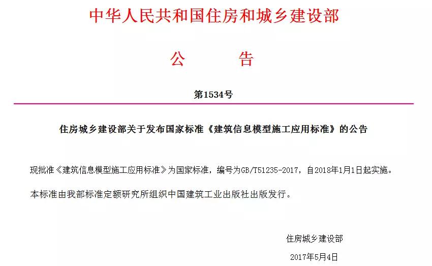 住建部印发标准《建筑信息模型施工应用标准》编号为GB/T51235-2017,自2018年1月1日起实施。