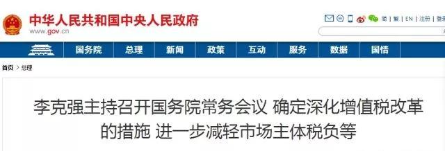 会议决定,从2018年5月1日起,一是将制造业等行业增值税税率从17%降至16%,将交通运输、建筑、基础电信服务等行业及农产品等货物的增值税税率从11%降至10%,预计全年可减税2400亿元。二是统一增值税小规模纳税人标准。将工业企业和商业企业小规模纳税人的年销售额标准由50万元和80万元上调至500万元,并在一定期限内允许已登记为一般纳税人的企业转登记为小规模纳税人,让更多企业享受按较低征收率计税的优惠。三是对装备制造等制造业、研发等现代服务业符合条件的企业和电网企业在一定时期内未抵扣完的进项税额予以一次性退还。实施上述三项措施,全年将减轻市场主体税负超过4000亿元,内外资企业都将同等受益。