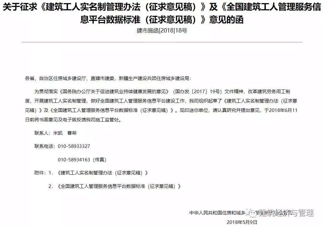 函件指出,为贯彻落实《国务院办公厅关于促进建筑业持续健康发展的意见》(国办发〔2017〕19号)文件精神,改革建筑劳务用工制度,开展建筑工人实名制管理,做好全国建筑工人管理服务信息平台建设工作,住建部建筑市场监管司组织起草了《建筑工人实名制管理办法(征求意见稿)》及《全国建筑工人管理服务信息平台数据标准(征求意见稿)》。现印送各省、自治区住房城乡建设厅、直辖市建委,新疆生产建设兵团住房城乡建设局征求意见。