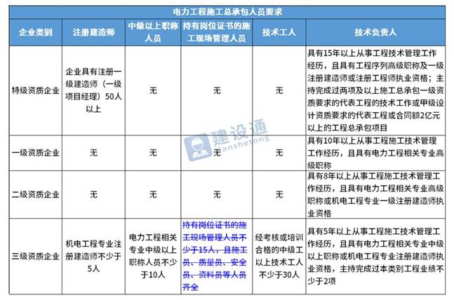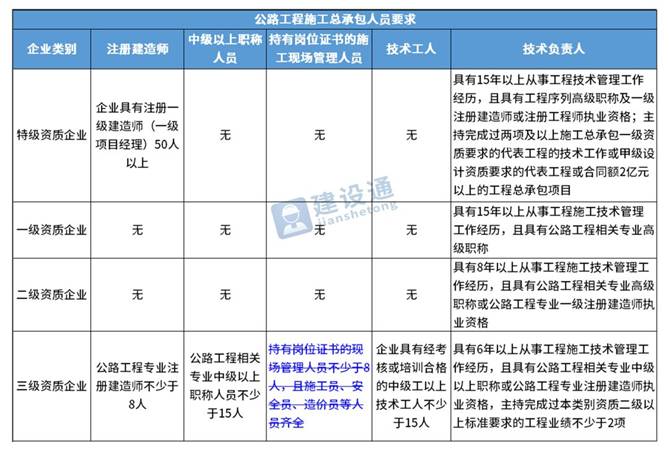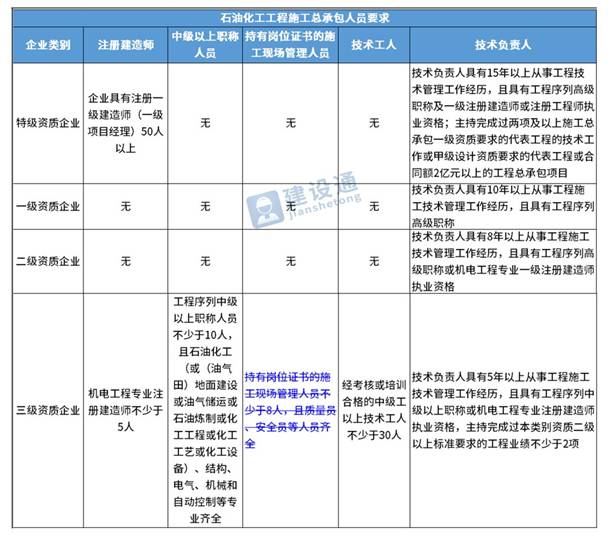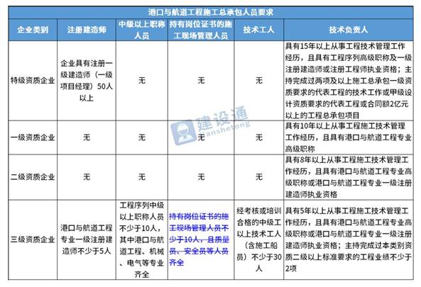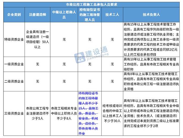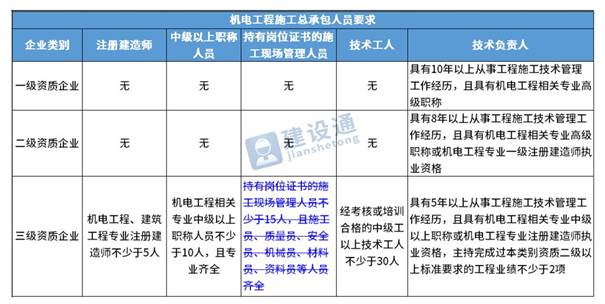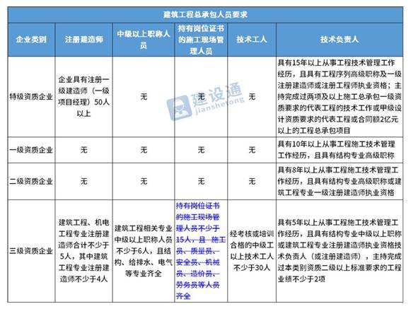 换句话说,并不是所有企业资质都不要求有建造师等企业人员。施工总承包三级资质企业对建造师等人员仍有要求,一级资质、二级资质企业保留技术负责人这一项要求,特级资质另有规定。