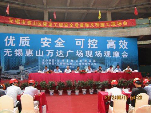 惠山万达秉承“诚信、盈利、和谐、超越”的项目核心文化,在六个职能部门、十一个工作组合计80多人的带领下,对项目的质量、安全、文明施工进行全方位的管理。区建设局通过组织此次对万达项目的观摩,学习借鉴企业在创建精品工程过程中的管理理念和科学的管理方法,以此来提高我区建设行业的管理水平,确保全区各类项目的顺利推进,并多创优质精品项目。现场会上播放了中建二局的宣传片,万达投资有限公司、中建二局和江苏五星等企业代表作了交流,全体参会人员在区建设局局长贡培生、中建二局党委副书记樊学民等领导的带领下,还参观了万达施工现场。