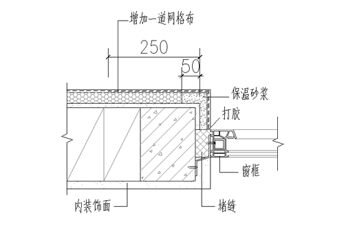 1.4外门窗洞口侧面外保温材料应采用保温砂浆,厚度为20mm。当外保温层厚度不超过30 mm,洞口保温砂浆应该转入立面50 mm(厚度同外保温层厚度)。