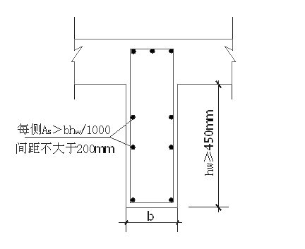 1.7 梁腹板高度hw≥450mm时,应在梁两侧面设置腰筋,钢筋直径不应小于12mm,每侧腰筋配筋率As>bhw/1000,间距不大于200mm如图7.1.1-2所示。