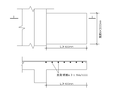 1.6 室外悬臂板挑出长度L≥400mm、宽度B≥3000mm时,应配抗裂分布钢筋,直径不应小于6mm,间距不应大于200mm,抗裂分布筋如图7.1.1-1所示。