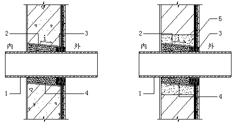 1.10穿过外墙的管道应采用套管,套管应内高外低,坡度不应小于5%,套管周边应作防水密封处理(图1.10-1、1.10-2)。