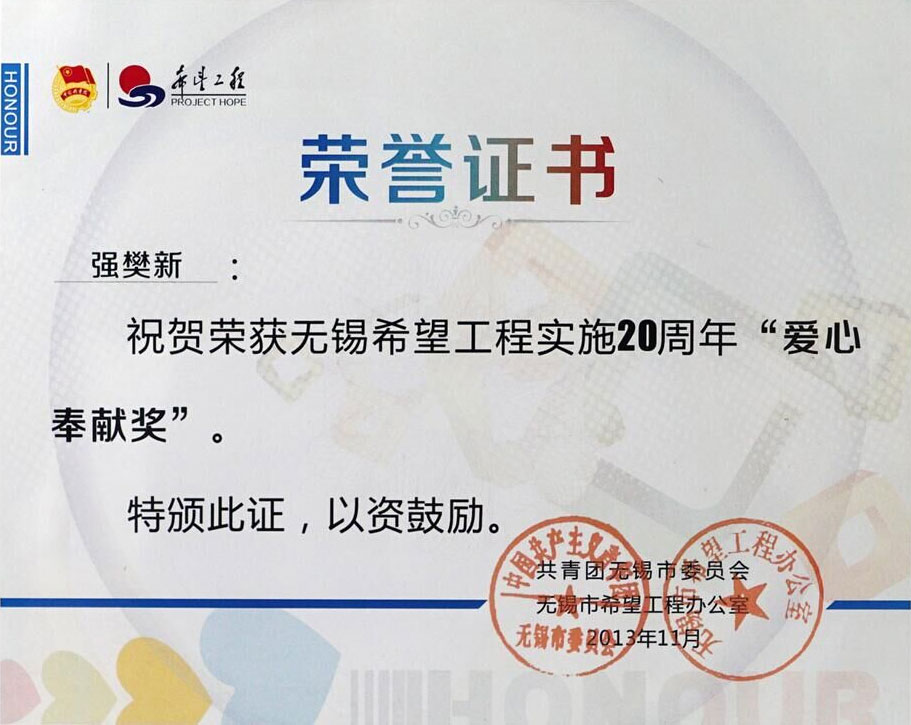 2013.11 无锡希望工程实施20周年爱心奉献奖